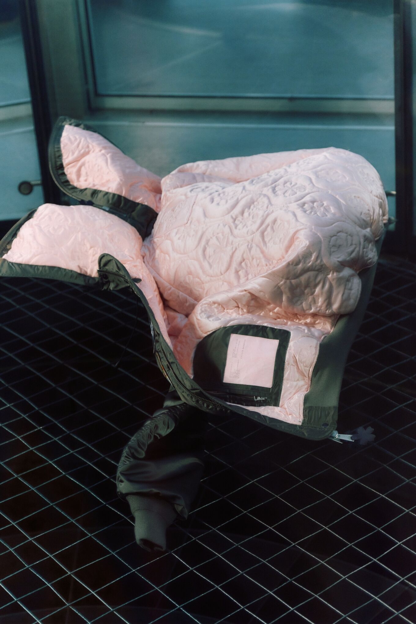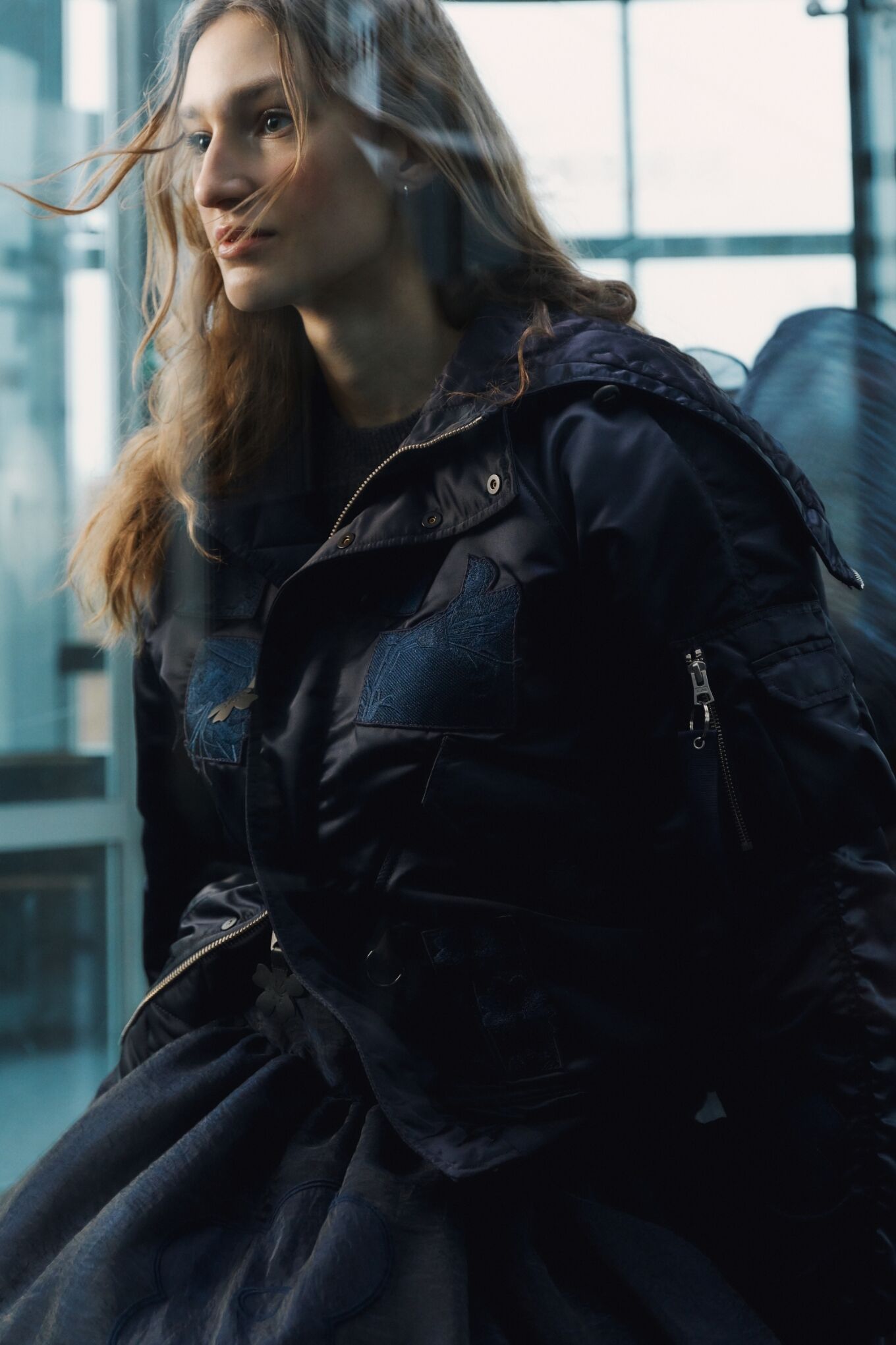 Im Zentrum stehen drei Silhouetten: eine cropped MA-1 und zwei Varianten der N-2B. Basierend auf Alpha’s Originaldesigns – gemacht für Funktion und Performance – werden sie durch Cecilie Bahnsens präzise Handwerkskunst neu gedacht.