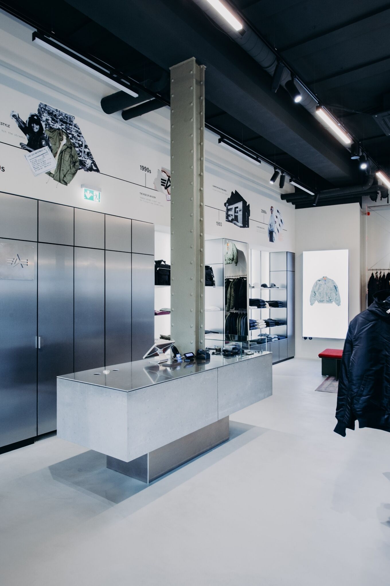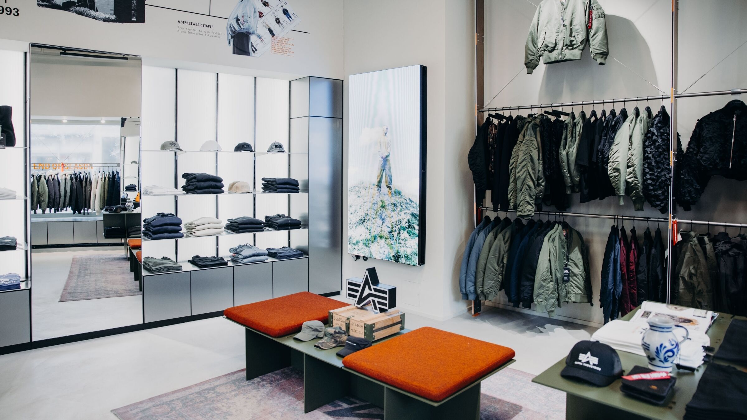 Known for their innovative approach to industrial design, they have crafted a space that embodies Alpha Industries’ legacy of military heritage while introducing a refined, contemporary edge. The design features clean lines, polished concrete, steel fixtures, and modular displays, capturing both the strength and simplicity that Alpha is known for.